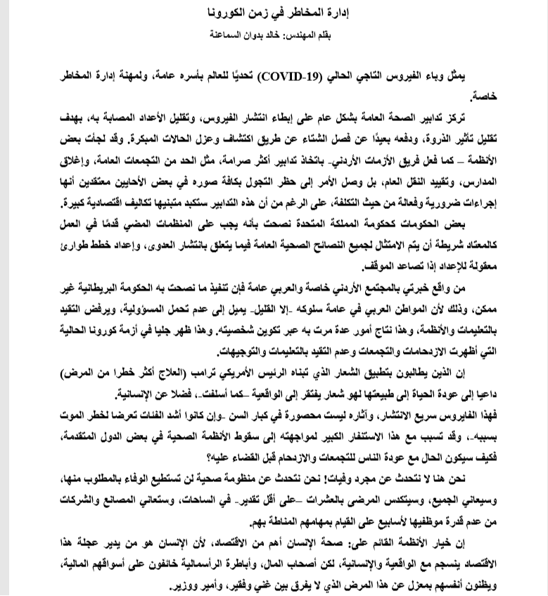 إدارة المخاطر في زمن الكورونا .. بقلم خبير المخاطر: م. خالد بدوان السماعنة