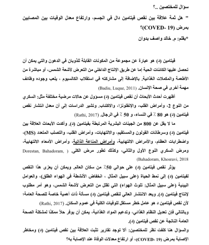 هل ثمة علاقة بين نقص فيتامين دال في الجسم وارتفاع معدل الوفيات بين المصابين بمرض كوفيد 19؟ .. بقلم خبير المخاطر: م. خالد بدوان السماعنة